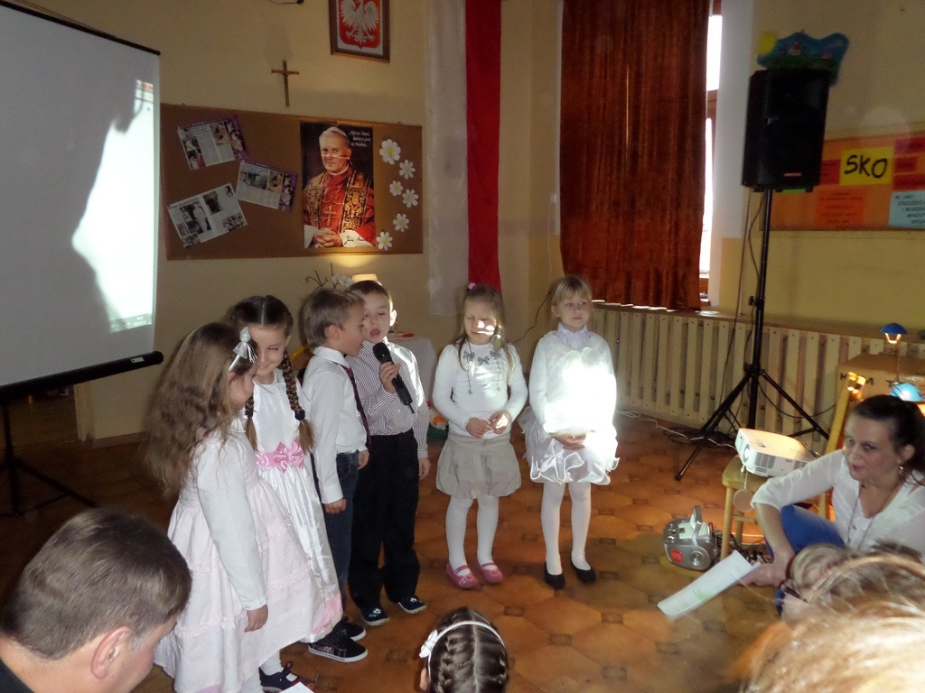 z oddziału przedszkolnego recytowały wiersze i śpiewały pieśni poświęcone papieżowi.  Karol Wojtyła był człowiekiem wielkiego serca, całego siebie powierzył Maryi, która nieustannie prowadziła Go przez życie do świętości. Z godnością przyjmował wielkie cierpienie, które nigdy Go nie opuszczało. Swą prostotą i przykładnym życiem zrzeszył wokół siebie tłumy wiernych, dla których był wzorem do naśladowania. Akademia była doskonałą okazją do przypomnienia chwil z życia i pontyfikatu Ojca Świętego, papieża Polaka, który był największym autorytetem moralnym współczesnego świata. Następnie została przedstawiona prezentacja multimedialna pt. „Totus Tuus”, która ukazywała to, że Ojciec Święty był papieżem pielgrzymem, papieżem cierpienia i wszystkich ludzi na ziemi.