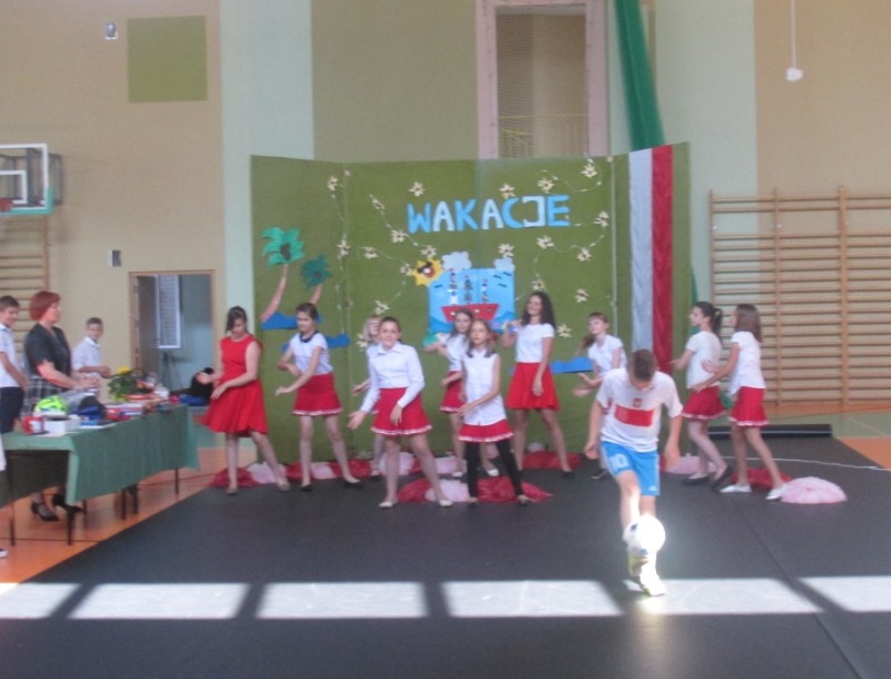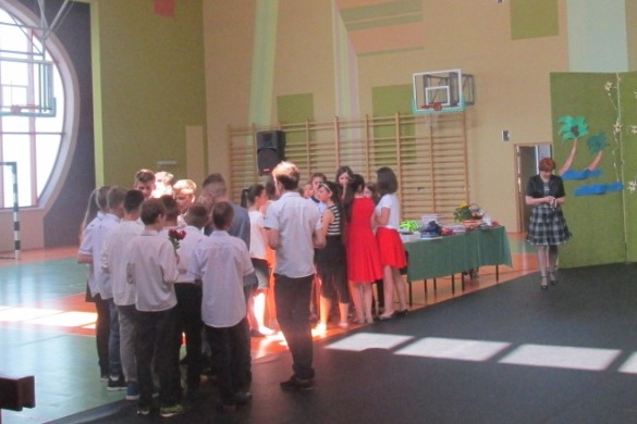 W dalszej części uroczystości wystąpili uczniowie klasy VI żegnając i dziękując wszystkim za lata spędzone w murach szkoły podstawowej. Nastepnie, podobnie jak w latach poprzednich również w tym roku, klasę VI pożegnała klasa V prezentując montaż słowno- muzyczny i taniec- niespodziankę.