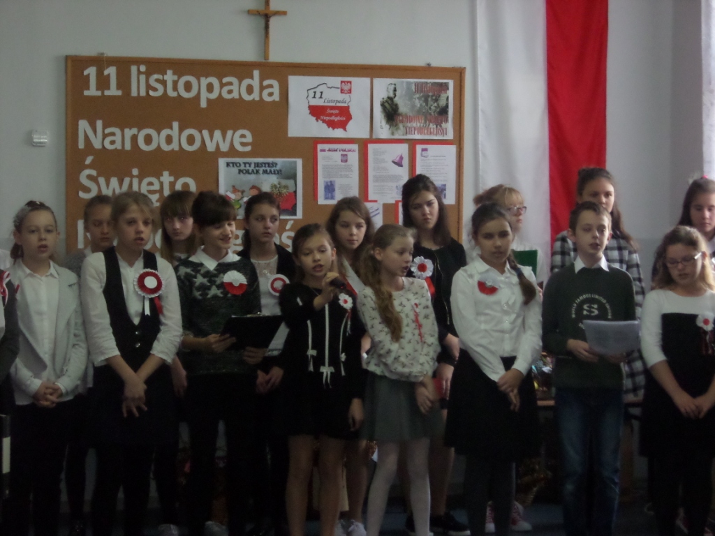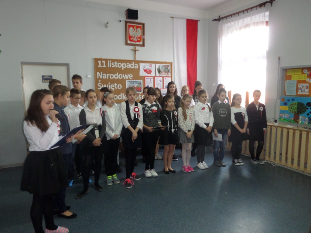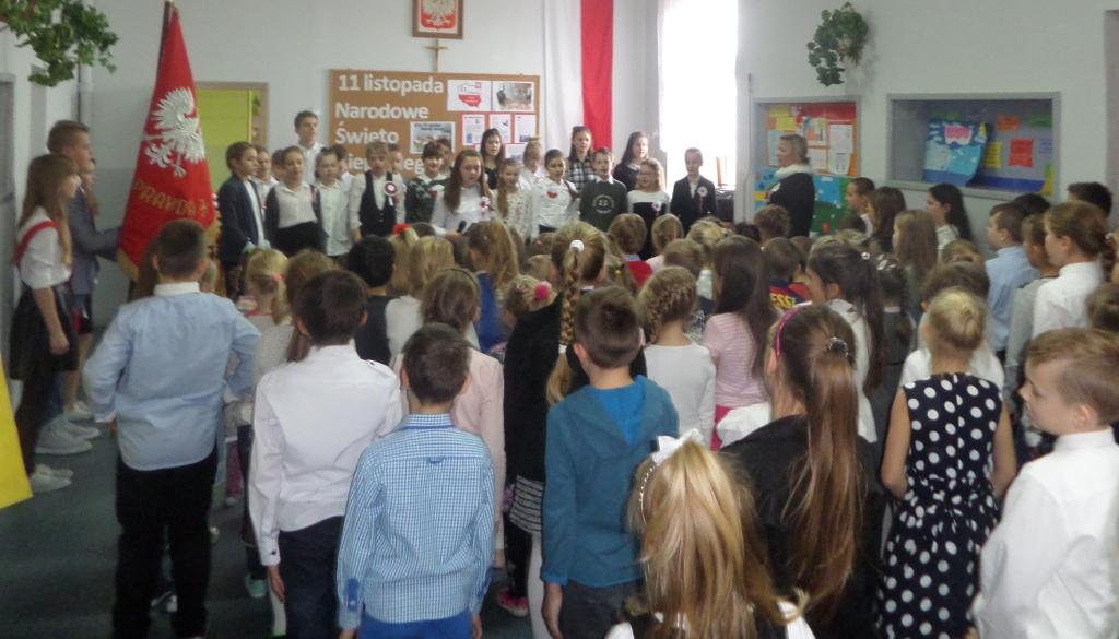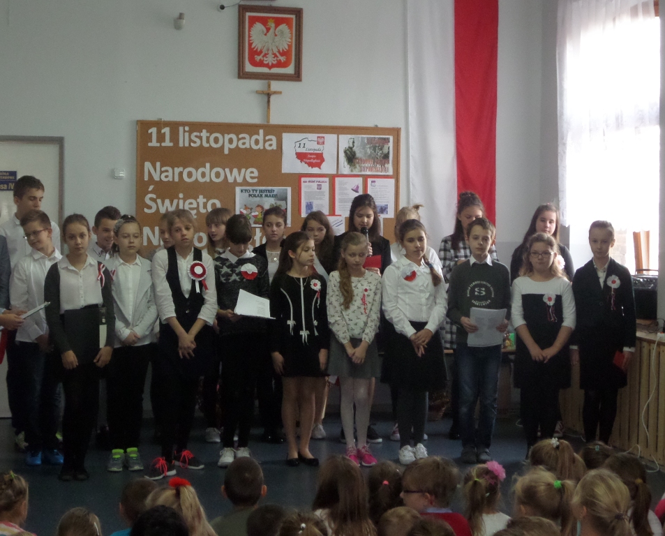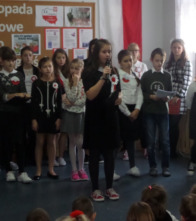 Dnia 10.11.2016r. odbyła się w naszej szkole uroczysta akademia z okazji święta 11 listopada. W tym roku obchodzimy 98 rocznicę odzyskania przez Polskę niepodległości. Część artystyczną przygotowaną przez uczniów klas: IV - VI pod opieką: p. Barbary Stachowicz poprzedziło wprowadzenie pocztu sztandarowego oraz wspólne odśpiewanie Hymnu Państwowego.