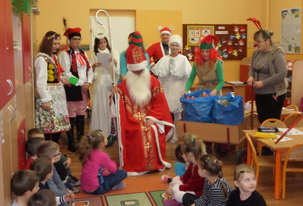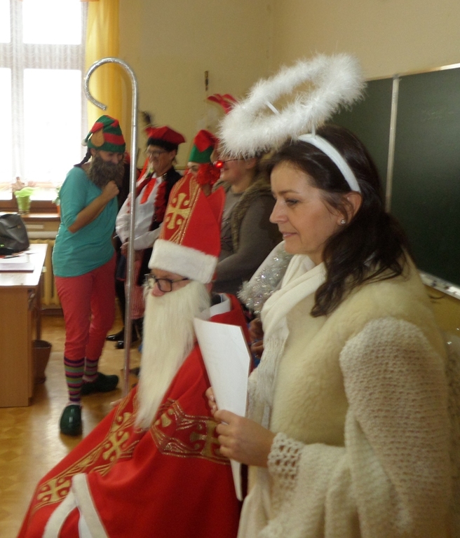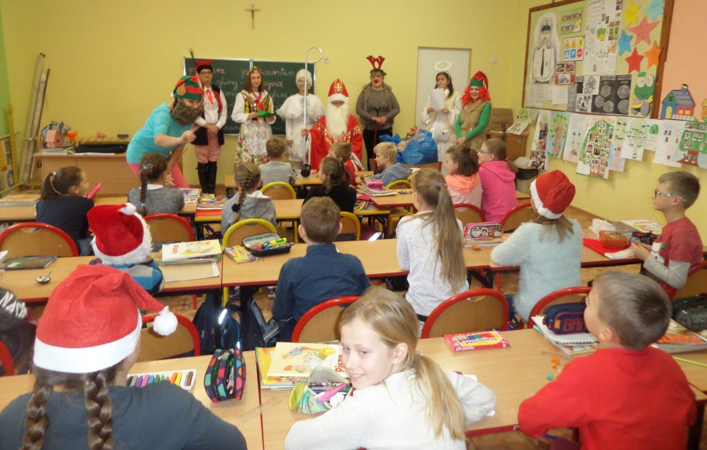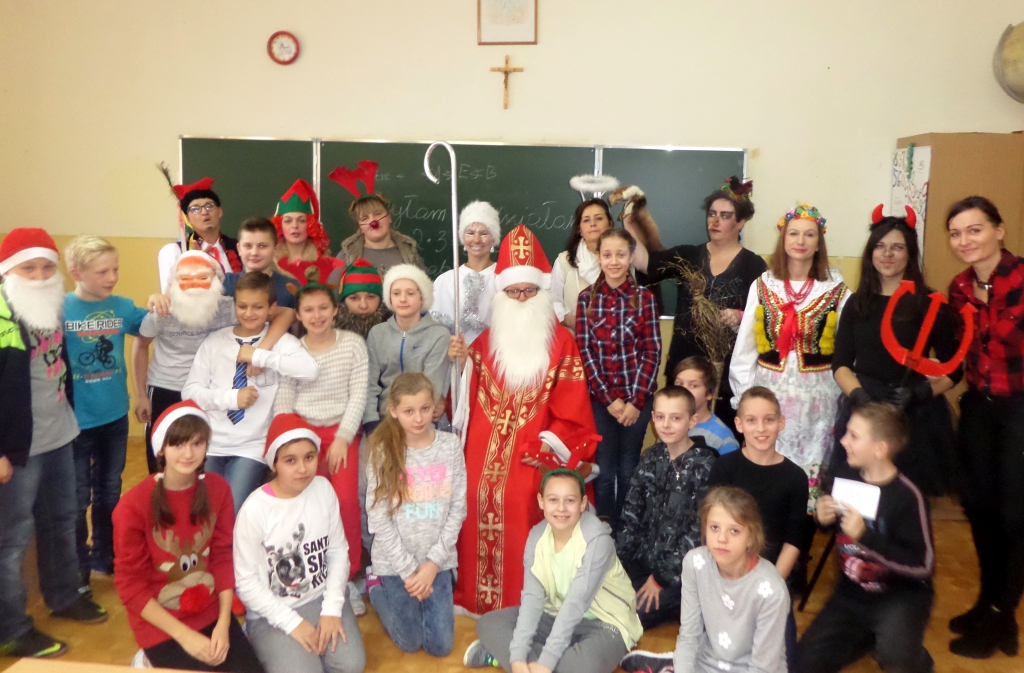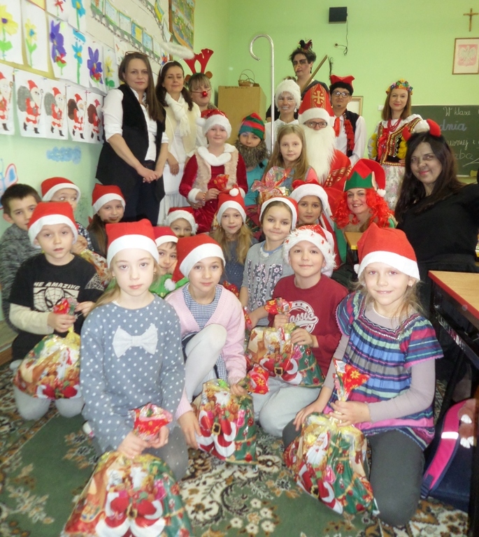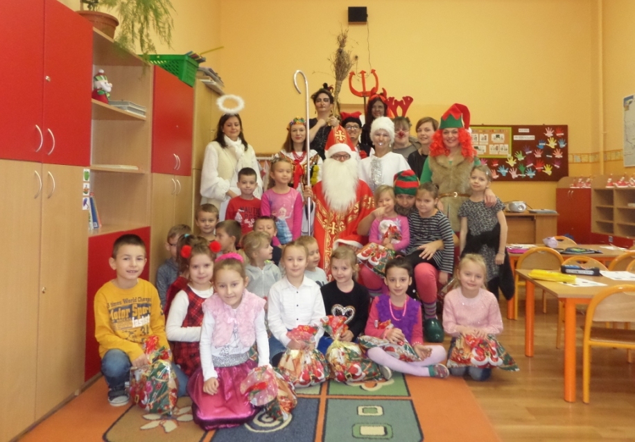 6 grudnia w naszej szkole pojawił się długo oczekiwany gość - ,,prawdziwy” św. Mikołaj. Najpierw było słychać diabła, wiedżmę, dzwoneczki pomocników – reniferów, Anioły, potem donośne „hou, hou, hou” i pojawił się on – ukochany św. Mikołaj! Odwiedził wszystkie klasy, każde dziecko obdarowane zostało wspaniałym prezentem. Wizyta Mikołaja i jego świty wywołał wiele radości i uśmiechu na twarzach dzieci. Podczas spotkania Mikołaj życzył wszystkim zdrowych i radosnych świąt Bożego Narodzenia. Obiecał, że powróci do nas za rok.