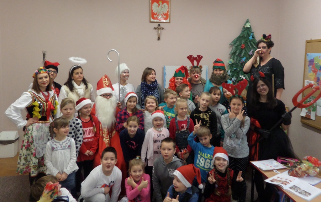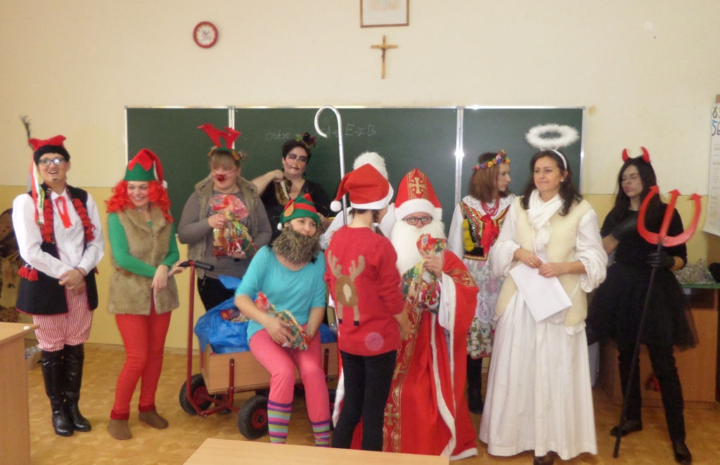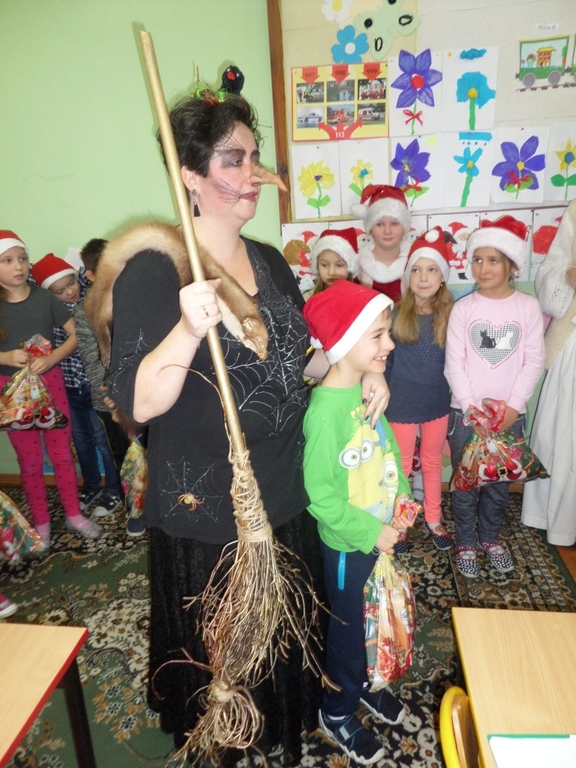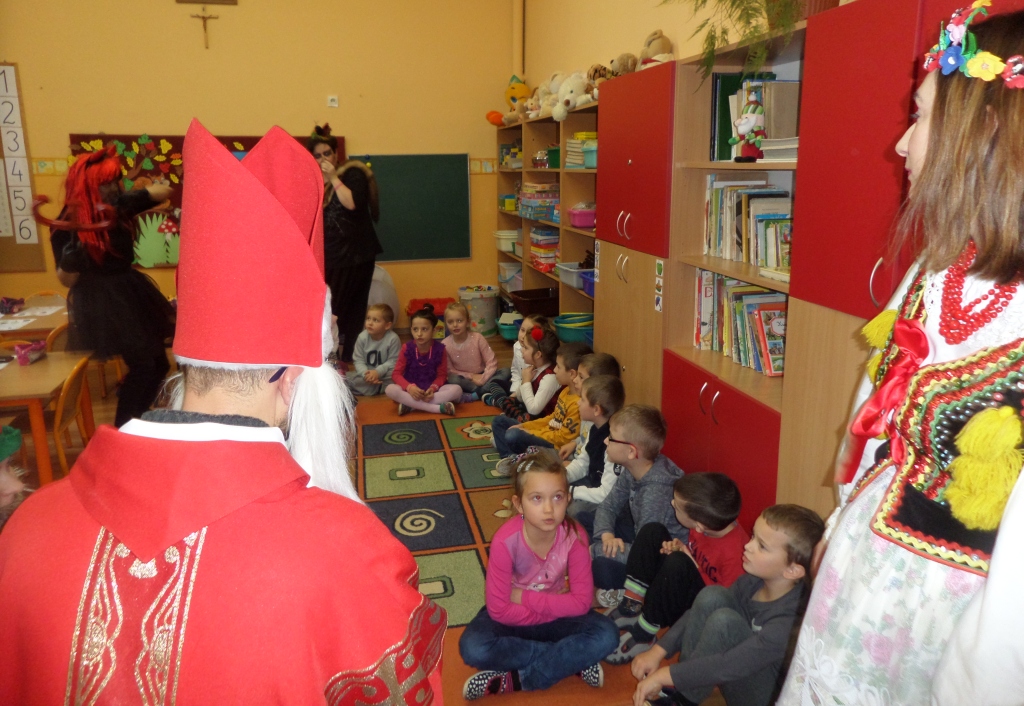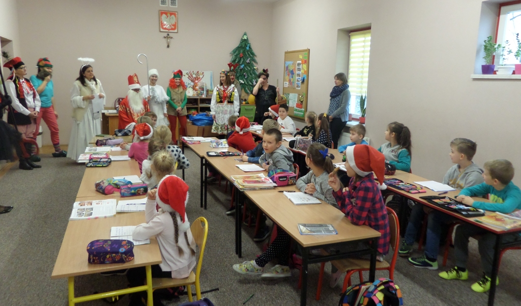 6 grudnia w naszej szkole pojawił się długo oczekiwany gość - ,,prawdziwy” św. Mikołaj. Najpierw było słychać diabła, wiedżmę, dzwoneczki pomocników – reniferów, Anioły, potem donośne „hou, hou, hou” i pojawił się on – ukochany św. Mikołaj! Odwiedził wszystkie klasy, każde dziecko obdarowane zostało wspaniałym prezentem. Wizyta Mikołaja i jego świty wywołał wiele radości i uśmiechu na twarzach dzieci. Podczas spotkania Mikołaj życzył wszystkim zdrowych i radosnych świąt Bożego Narodzenia. Obiecał, że powróci do nas za rok.