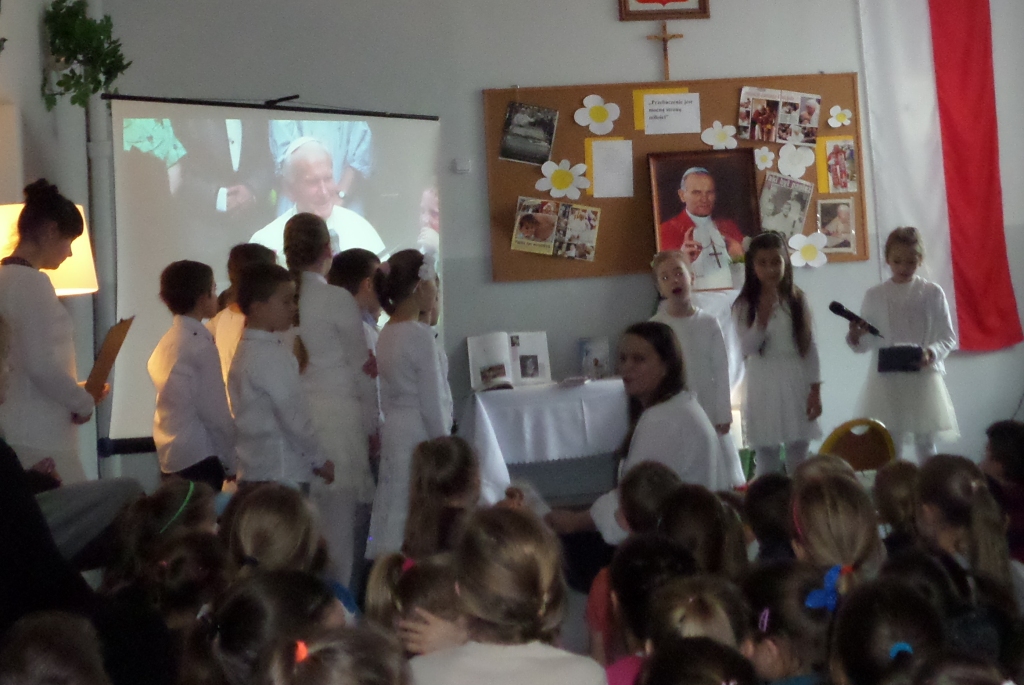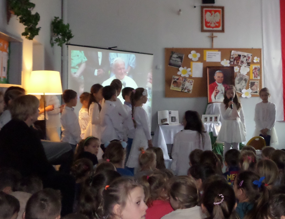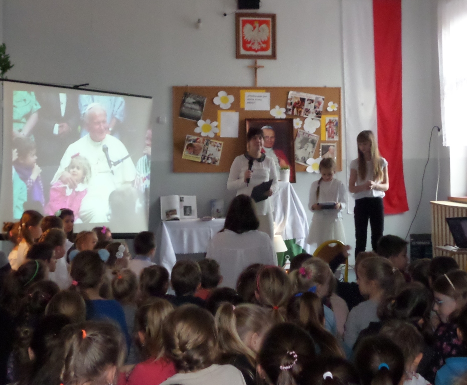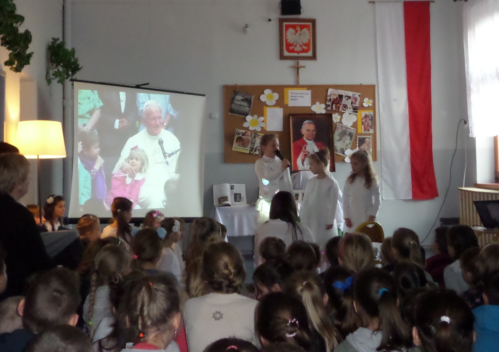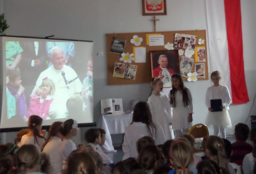 Dnia 08.12.2016r. uczniowie z naszej szkoły przedstawili piękny montaż słowno-muzyczny poświęcony Janowi Pawłowi II. W tym roku przewodnim hasłem były słowa Jana Pawła II „Przebaczenie jest mocne mocą miłości”. Głównymi wykonawcami, byli uczniowie z klasy II i VI, dzieci uzdolnione, zaangażowane, bardzo wrażliwe, przeżywające swoje osiągnięcia i postępy. Cały scenariusz podkreślał wybitną postać wybitnego Polaka, jego dobro uczynione dla ludzkości, niezastąpiony autorytet moralny. Mali aktorzy podczas wystąpienia bardzo entuzjastycznie wczuli się w swoje role, które wzbogacone były tekstami papieskimi z melodycznym podkładem, a także fragmentami filmów z pielgrzymek Jana Pawła II. Na zakończenie pani dyrektor mgr Bogumiła Sala podziękowała uczniom i nauczycielom za przygotowanie montażu słowno- muzycznego. Wskazała, że Jan Paweł II jest autorytetem dla każdego dziecka, jak i dla nas dorosłych. Na godną uwagę, zasługuje także udział rodziców w akademii, co jest bardzo budujące w kształtowaniu młodego pokolenia.
