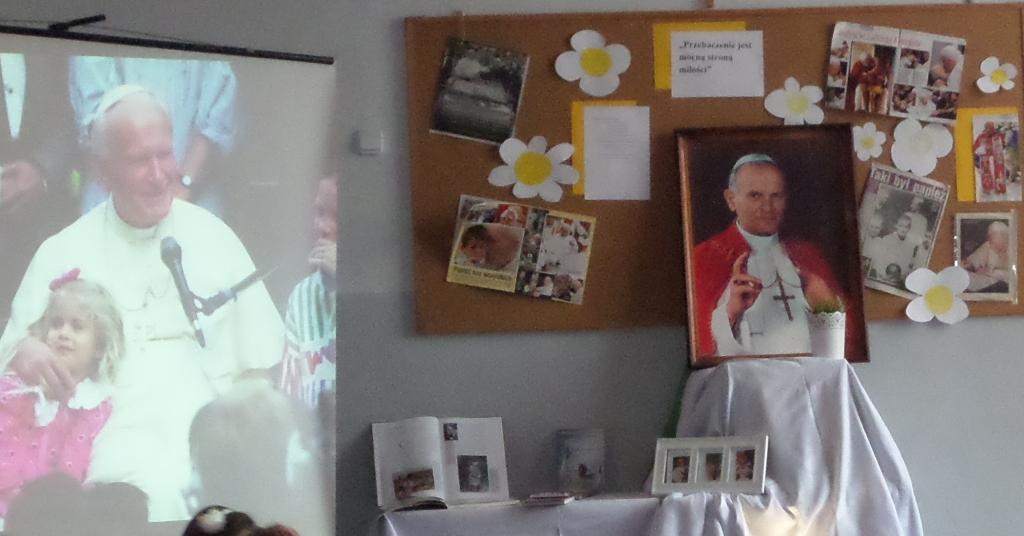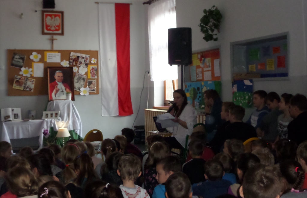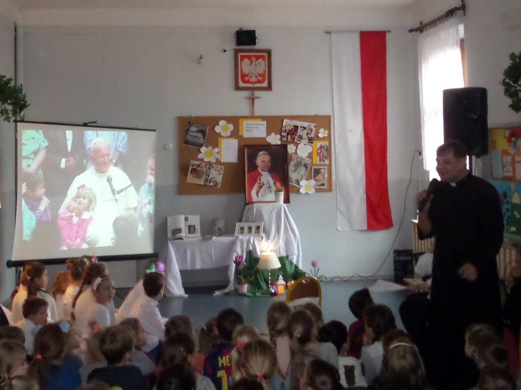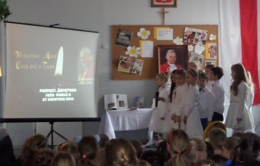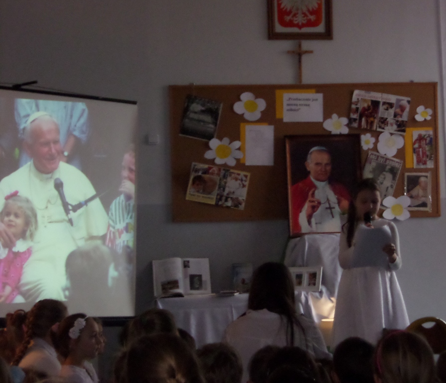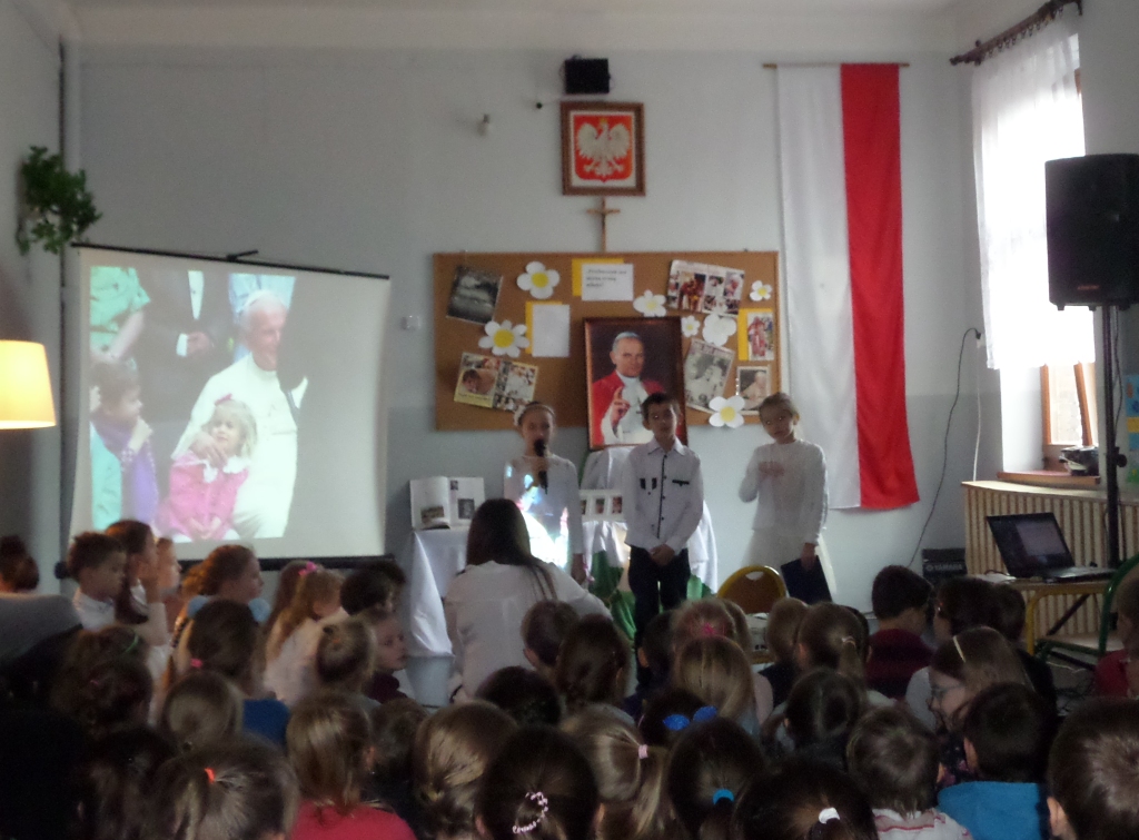 Dnia 08.12.2016r. uczniowie z naszej szkoły przedstawili piękny montaż słowno-muzyczny poświęcony Janowi Pawłowi II. W tym roku przewodnim hasłem były słowa Jana Pawła II „Przebaczenie jest mocne mocą miłości”. Głównymi wykonawcami, byli uczniowie z klasy II i VI, dzieci uzdolnione, zaangażowane, bardzo wrażliwe, przeżywające swoje osiągnięcia i postępy. Cały scenariusz podkreślał wybitną postać wybitnego Polaka, jego dobro uczynione dla ludzkości, niezastąpiony autorytet moralny. Mali aktorzy podczas wystąpienia bardzo entuzjastycznie wczuli się w swoje role, które wzbogacone były tekstami papieskimi z melodycznym podkładem, a także fragmentami filmów z pielgrzymek Jana Pawła II. Na zakończenie pani dyrektor mgr Bogumiła Sala podziękowała uczniom i nauczycielom za przygotowanie montażu słowno- muzycznego. Wskazała, że Jan Paweł II jest autorytetem dla każdego dziecka, jak i dla nas dorosłych. Na godną uwagę, zasługuje także udział rodziców w akademii, co jest bardzo budujące w kształtowaniu młodego pokolenia.